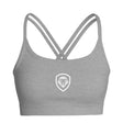 Women's Lion Shield Gray Strappy Sports Bra - XS is backordered and will ship as soon as it is back in stock.